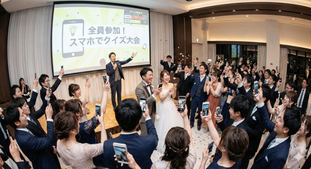 年間数百現場をこなすプロの司会者とディレクターが進行を管理するため、タイムスケジュールの遅延やマイクのハウリング、内輪ノリによるゲストの疎外感をなくします。万全の機材チェックと、1,000以上の提携会場とのスムーズな連携により、どの会場を選んでもご満足いただけるのエンターテインメント品質をご提供いたします。ただ見るだけの余興ではなく、ゲスト全員がスマホで参加できるゲームなど、最新の演出を装備していますので、参加ゲストの一体感や満足度が高まり、「一部の人しか楽しめない」という二次会あるあるを解消します。