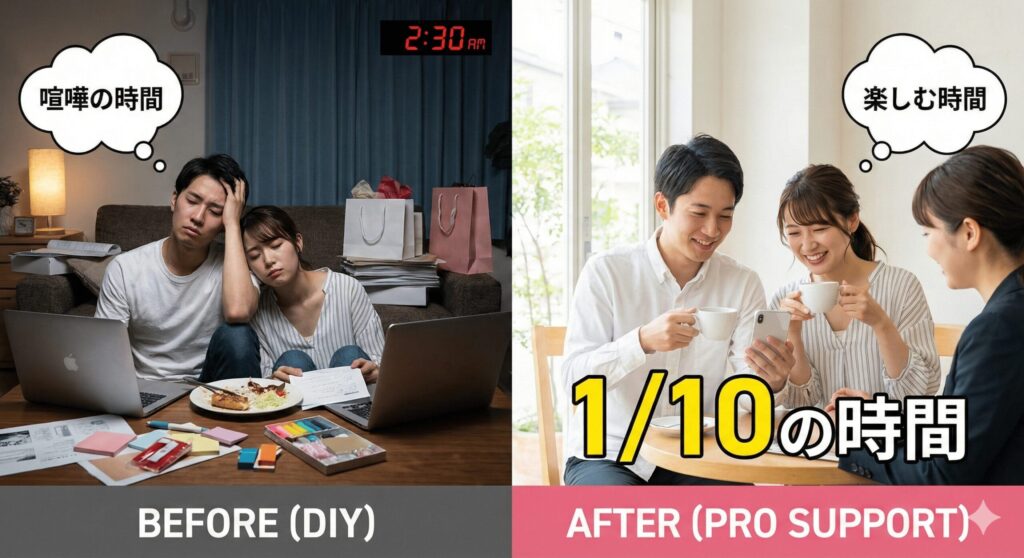 会場探し、招待状、景品の買い出し、当日の進行表…。本来なら数ヶ月かかる準備も、二次会サポーターズなら数回のLINEと打ち合わせだけで完了します。新郎新婦が費やす時間は、平均して数回の打ち合わせのみとなります。これにより、披露宴の準備や新生活への引越し作業に集中できる環境が整い、結婚式直前の睡眠不足やパートナーとの衝突といった精神的リスクを構造的に回避することが可能になります。